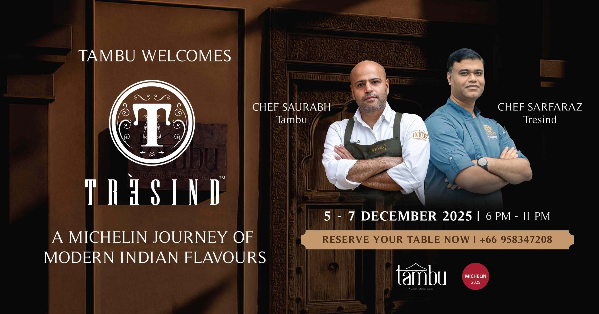 This three-night collaboration unites two distinguished chefs: Chef Saurabh Sachdeva of Tambu, an Iron Chef Thailand winner celebrated for his mastery of progressive Indian charcoal cuisine, and Chef Sarfaraz Ahmed, Executive Chef of Trรจsind Mumbai, working under the vision of Chef Himanshu Saini, one of the worldโs most influential voices in contemporary Indian gastronomy.